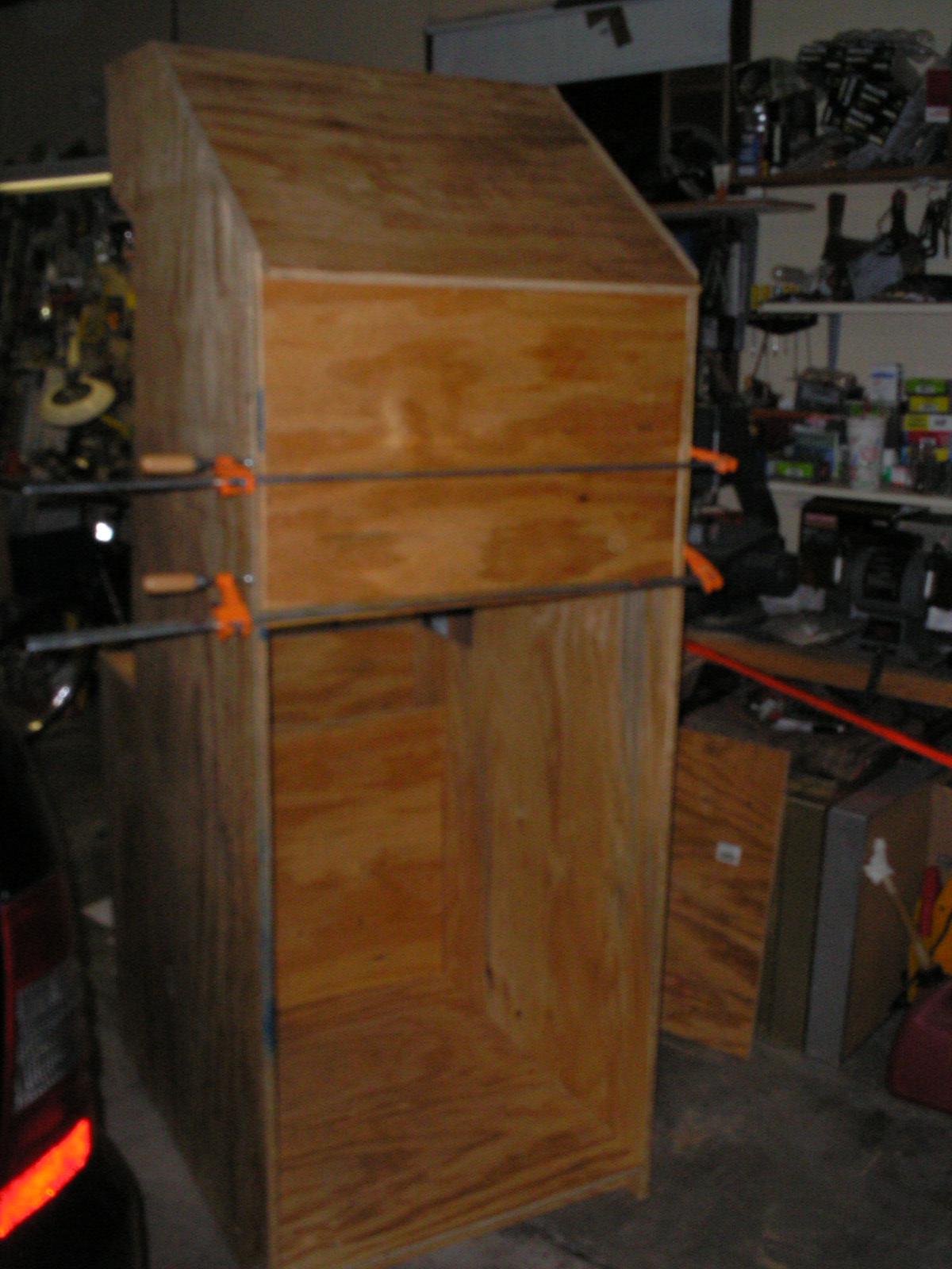 After attaching the sides, screwed on the top, back, and front panels to help support the sides. Used some carpenters glue to help hold everything together.