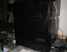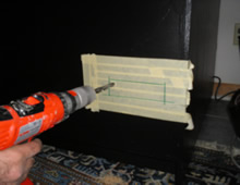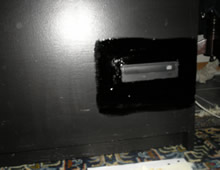 After the drive was screwed down into place, I had to clean up the job to make it look nice. So I taped the front of the drive to protect it and took some wood putty and filled in all the gaps around the drive to make it look like one piece. After the putty dried, I peeled off the tape to see how much sanding was needed to made the drive look like a part of the cabinet. After some sanding, I put on a new layer of tape and used the same semi-gloss black paint to color the putty. (In the picture the paint is still wet)