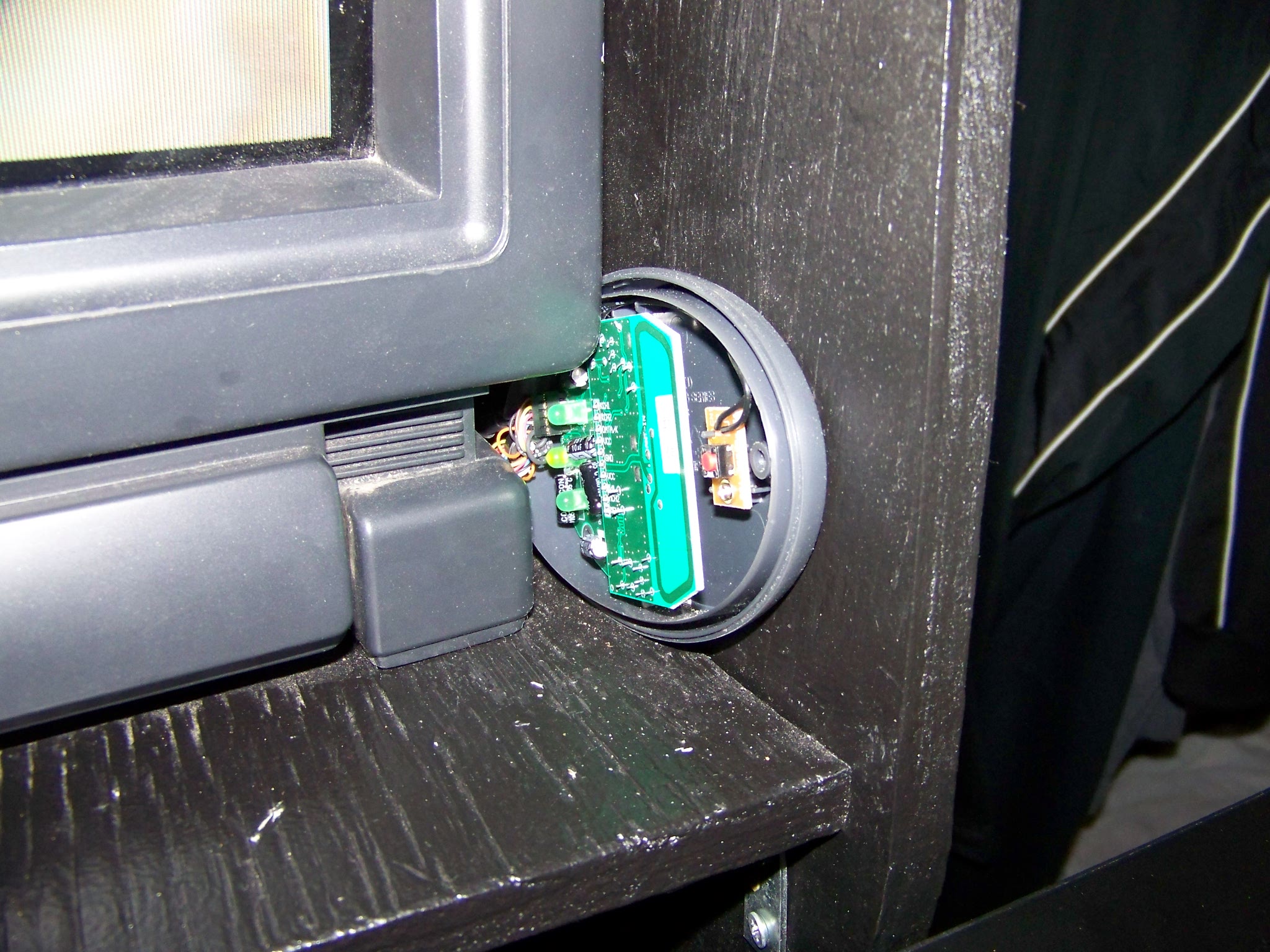 Added a mini amp and sub with volume control knobs next to the power switch. Wireless keyboard support adapter if to the right of the screen for now, and also added network plug on the side of the cabinet located above the power extension cable.