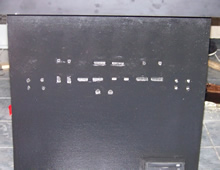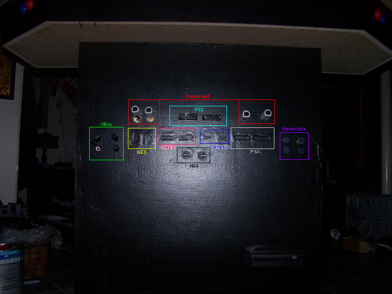 Finished the front where all the console adapters go. Added Xbox, PS2, Gamecube, and Dreamcast. Here are some images of the holes being drilled, adapters being fitted and puttied, and finally being sanded and painted.